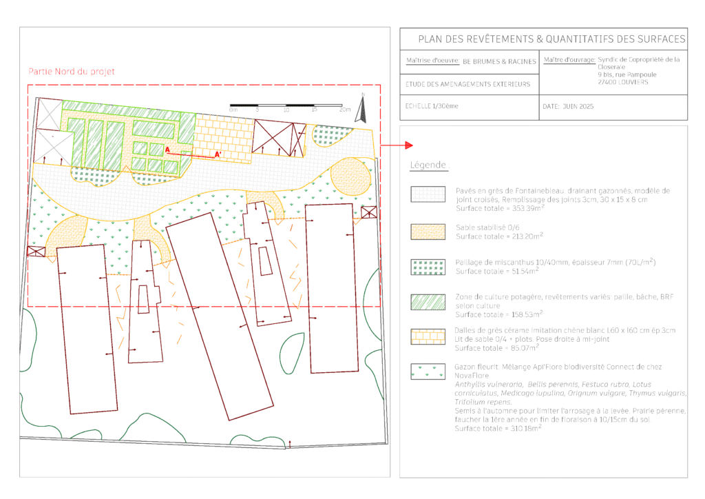 Le plan des revêtements définit les matériaux employés (terrasse, allées, bordures, murets…), assurant une cohérence esthétique et technique sur l’ensemble du jardin.