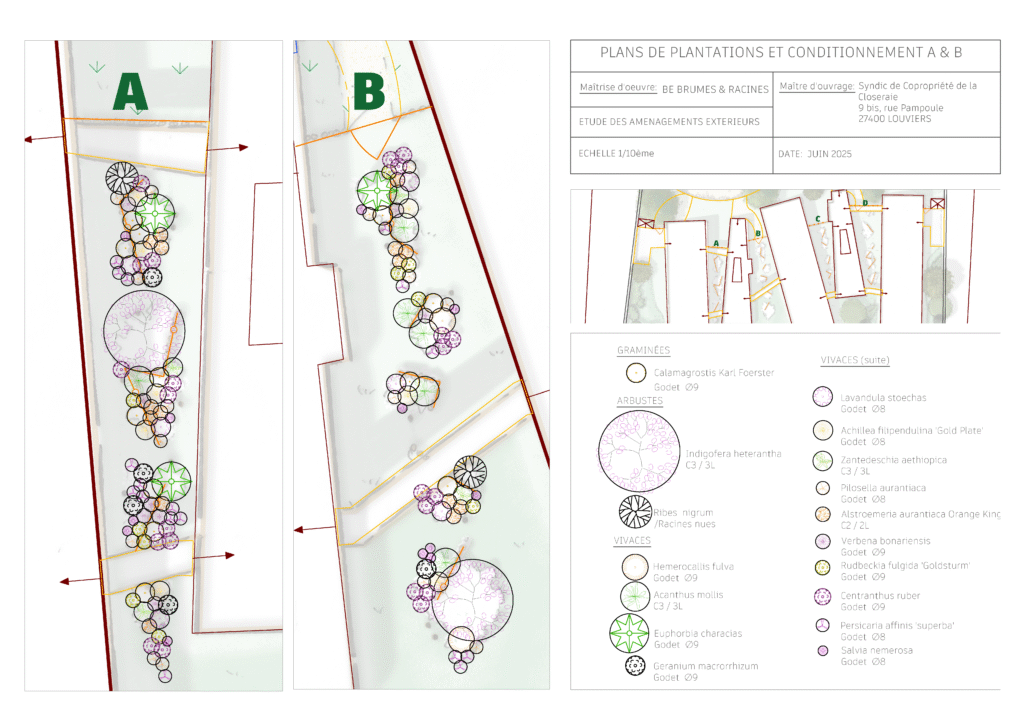 Le plan de plantation précise la disposition exacte de chaque végétal, ses dimensions à maturité et ses associations, garantissant une composition équilibrée et durable.