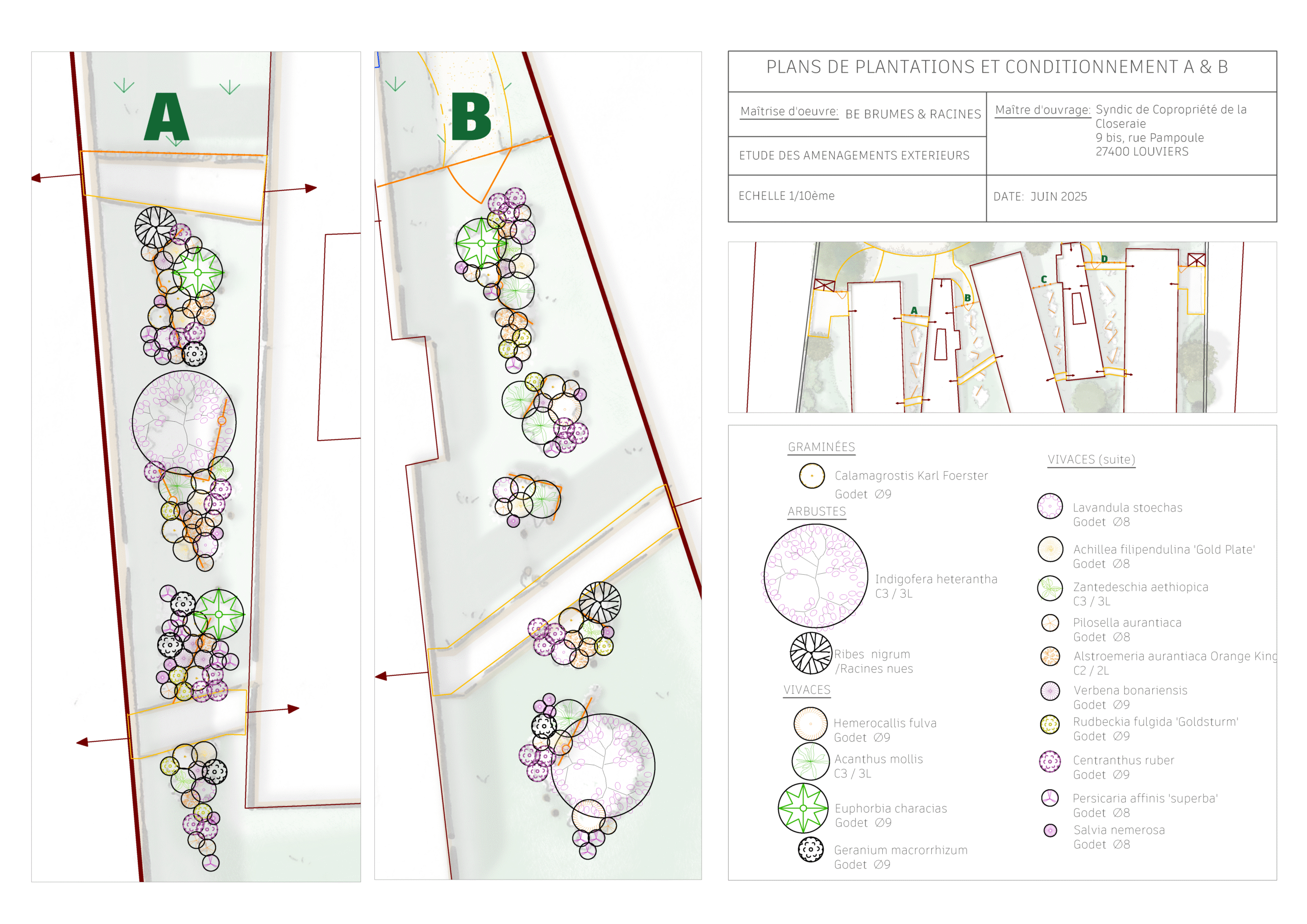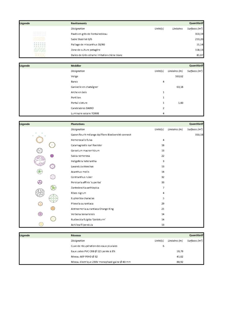 • Un plan de plantation, revêtements, réseaux avec les emplacements précis + quantitatif des végétaux pour les devis