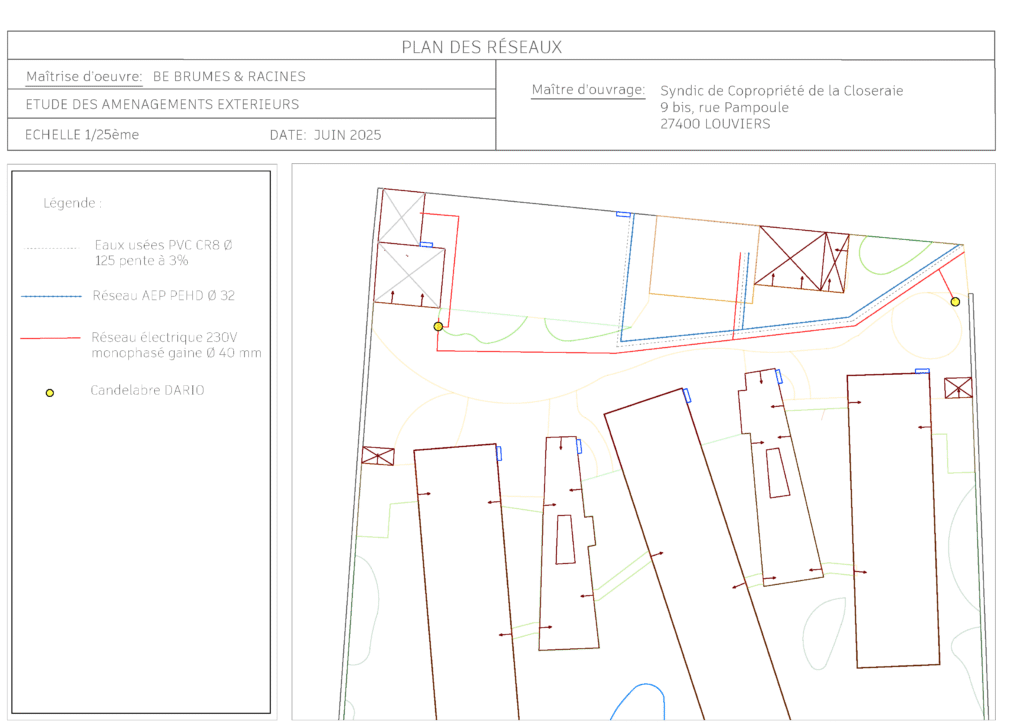 Enfin, le plan des réseaux (éclairage, arrosage, gestion des eaux pluviales…) anticipe les aspects pratiques pour un espace à la fois beau et fonctionnel.