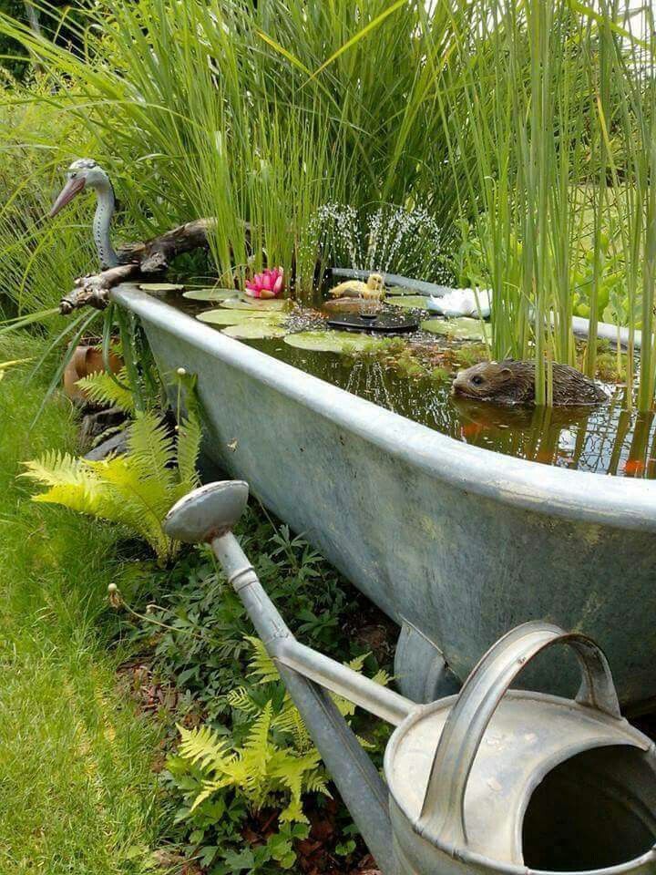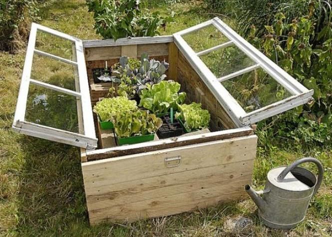 Un mobilier de jardin en réemploi : palettes transformées en bancs, anciennes cuves reconverties en bacs plantés.