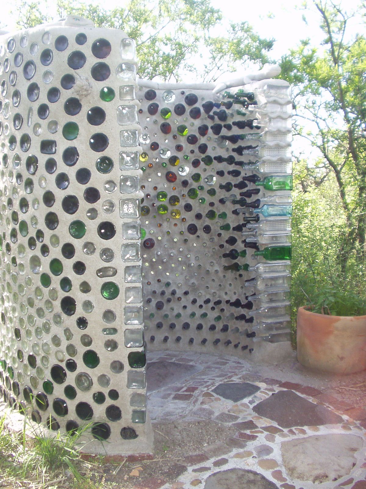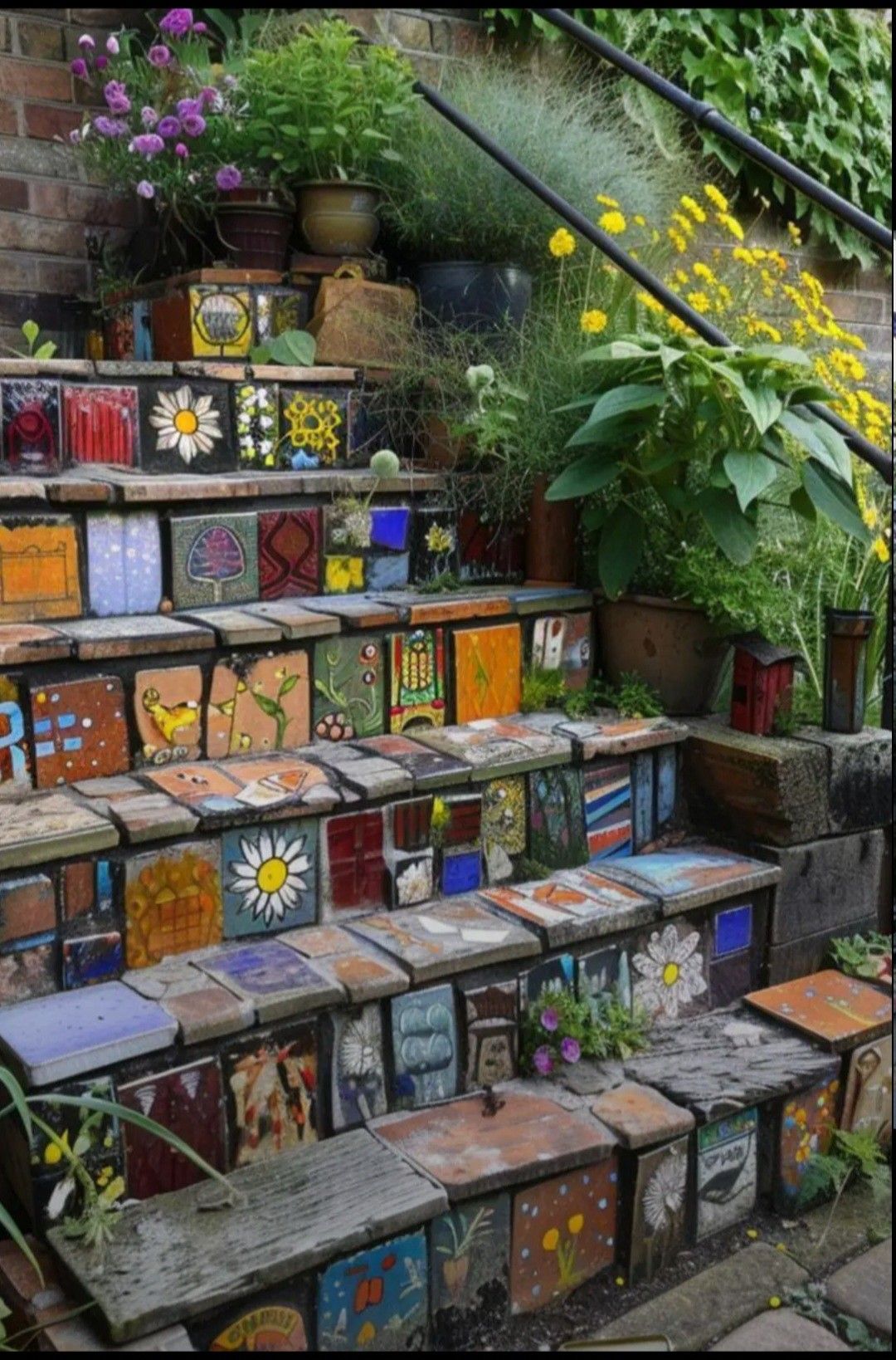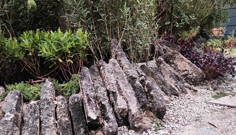 Des bordures en matériaux récupérés : vieilles tuiles, traverses de chemin de fer recyclées, pierres de chantier.