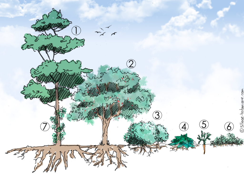 On y retrouve des Arbres à haute canopée (1), des arbres fruitiers (2) plus petits, des arbustes à petits fruits (3), des plantes vivaces comestibles ou herbacées (4), des plantes-acines (5), des couvre-sol (6), sans oublier les grimpantes (7). Chaque plante remplit plusieurs fonctions : nourrir, protéger le sol, attirer les pollinisateurs ou stocker l’eau.